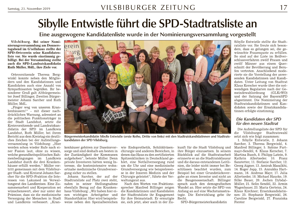 Bei seiner Nominierungsversammlung am Donnerstagabend im Gsellnhaus stellte der SPD-Ortsverein seine Kandidatenliste vor. Die 45-jährige Betriebswirtin Sibylle Entwistle wurde einstimmig gebilligt. Sie führt die SPD-Stadtratsliste an und kandidiert auch für das Amt der 1. Bürgermeisterin.