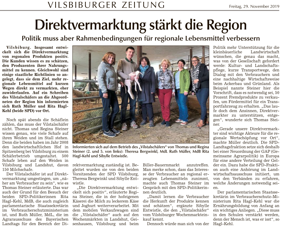 Politik muss aber Rahmenbedingungen für regionale Lebensmittel verbessern. Insgesamt entwickelt sich die Direktvermarktung von regionalen Produkten positiv. Die Kunden wissen es zu schätzen, den Produzenten ihrer Nahrungsmittel zu kennen. Ruth Müller und Rita Hagl-Kehl (beide SPD) informierten sich auf dem Betrieb des ‚Vilstalschäfers‘ von Thomas und Regina Steiner.