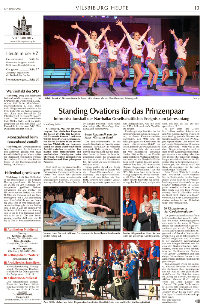 Inthronisationsball der Narrhalla: Gesellschaftliches Ereignis zum Jahresanfang. Was für ein Prinzenpaar wurde gemeinsam mit den großen Garde Prinzessin Vanessa I. und seine Prinzessin Florian I. beweisen viel Humor und Tanz. Von Geschick zeugten auch die Beiträge der Tanzsektionen Showdanz, aber einer Narrhallaschau, die musikalisch weniger Stunden bis zum nächsten Halt gingen. Die Bits baute auch in diesem Jahr landestreu für die Jugendmusik.