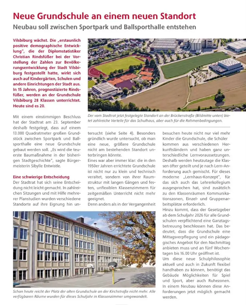 Vilsbiburg wächst. Die erstaunlich positive demografische Entwicklung wirkt sich auch auf Kindergärten, Schulen und andere Einrichtungen aus. In 15 Jahren werden an der Grundschule Vilsbiburg 28 Klassen unterrichtet. Mit einem einstimmigen Beschluss hat der Stadtrat festgelegt, dass auf einem 13.000 Quadratmeter großen Grundstück zwischen Sportpark und Ballsporthalle eine neue Grundschule gebaut werden soll.
