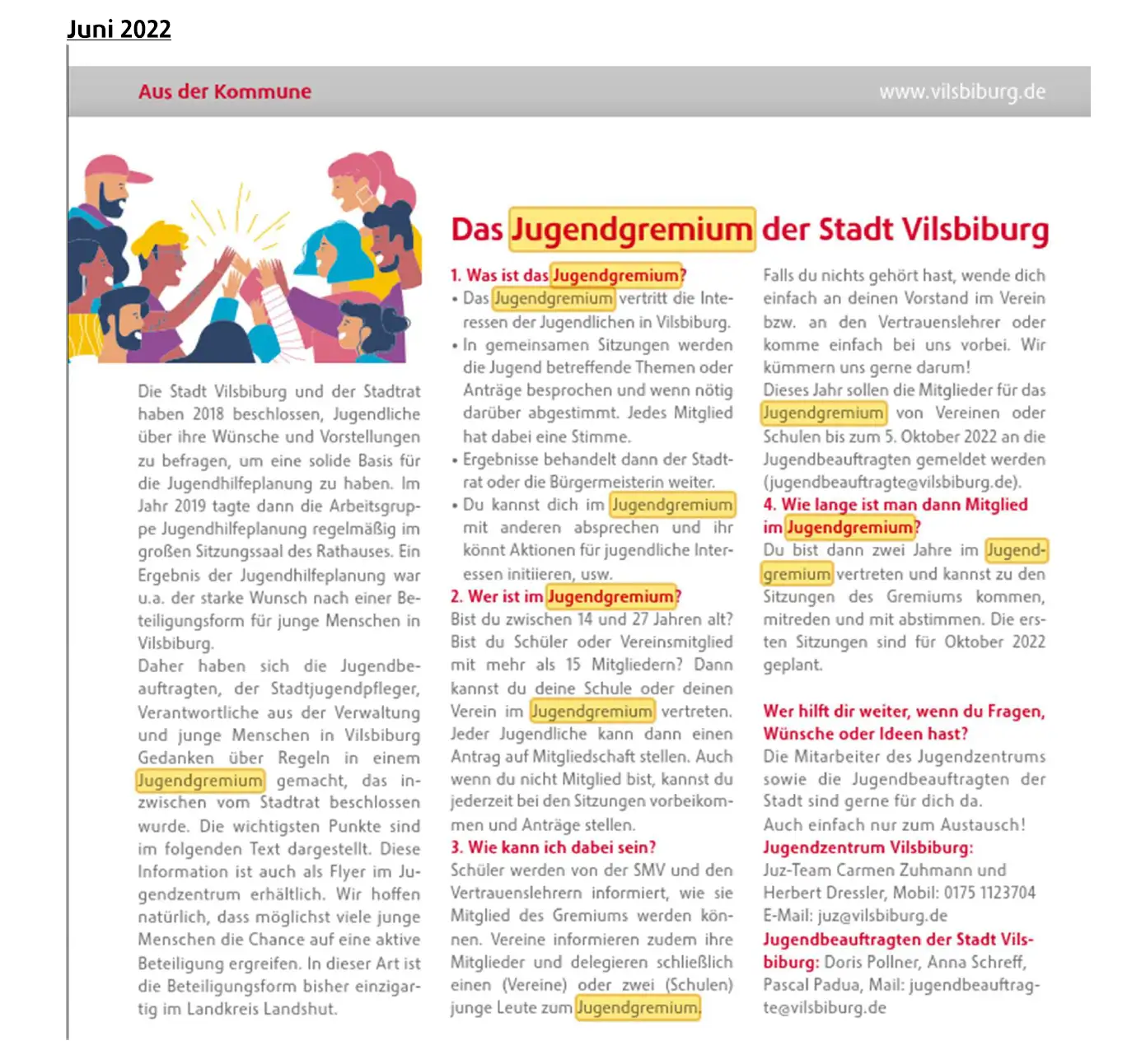 Alle jungen Menschen und natürlich alle interessierten Erwachsenen sind dazu herzlich eingeladen. Die Vorsitzende Anna Obermaier führt durch die Tagesordnung. Das Jugendgremium existiert nun seit fast zwei Jahren. Junge Menschen von 14 bis 27 Jahren können sich entweder von ihrem Verein oder ihrer Schule delegieren lassen oder können sich selbstständig beim Jugendgremium als Mitglied bewerben. Das Jugendgremium freut sich am 6. Juni um 18.30 Uhr auf viele Jugendliche, die ihr Mitspracherecht in ihrer Stadt Vilsbiburg wahrnehmen möchten.