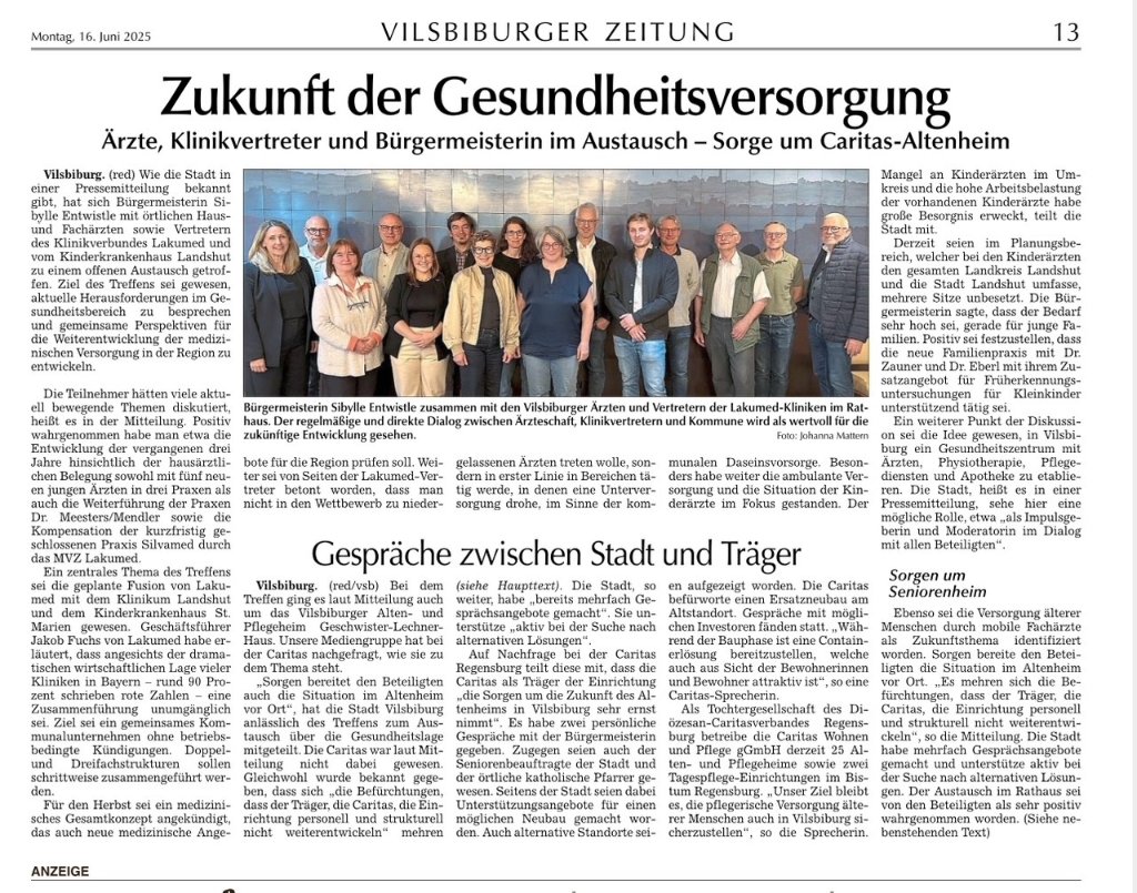 Bürgermeisterin Sibylle Entwistle hat sich mit Hausärzten, Kinderärzten und Fachärzten sowie Vertretern der Klinikverbünde Lakumed und vom Kinderkrankenhaus Landshut zu einem offenen Austausch getroffen. Ziel des Treffens sei gewesen, aktuelle Herausforderungen im Gesundheitsbereich zu besprechen und gemeinsame Perspektiven für die Weiterentwicklung der medizinischen Versorgung in der Region zu entwickeln.