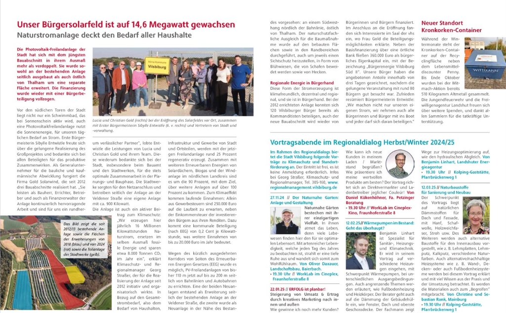 Die Photovoltaik-Freiflächenanlage der Stadt liegt im Bau. Ein neuer Bauabschnitt in einem Ausmaß von mehr als verdoppelt. Die Finanzierung wurde mit einer Bürgerbeteiligung vollzogen. Die Anlage erzeugt jährlich 16 Millionen Kilowattstunden grünen Strom. Bürgermeisterin Sibylle Entwistle freut sich über die gelungene Erweiterung. Lokale Erzeugung von Strom ist ein wichtiger Baustein für die Stadt.
