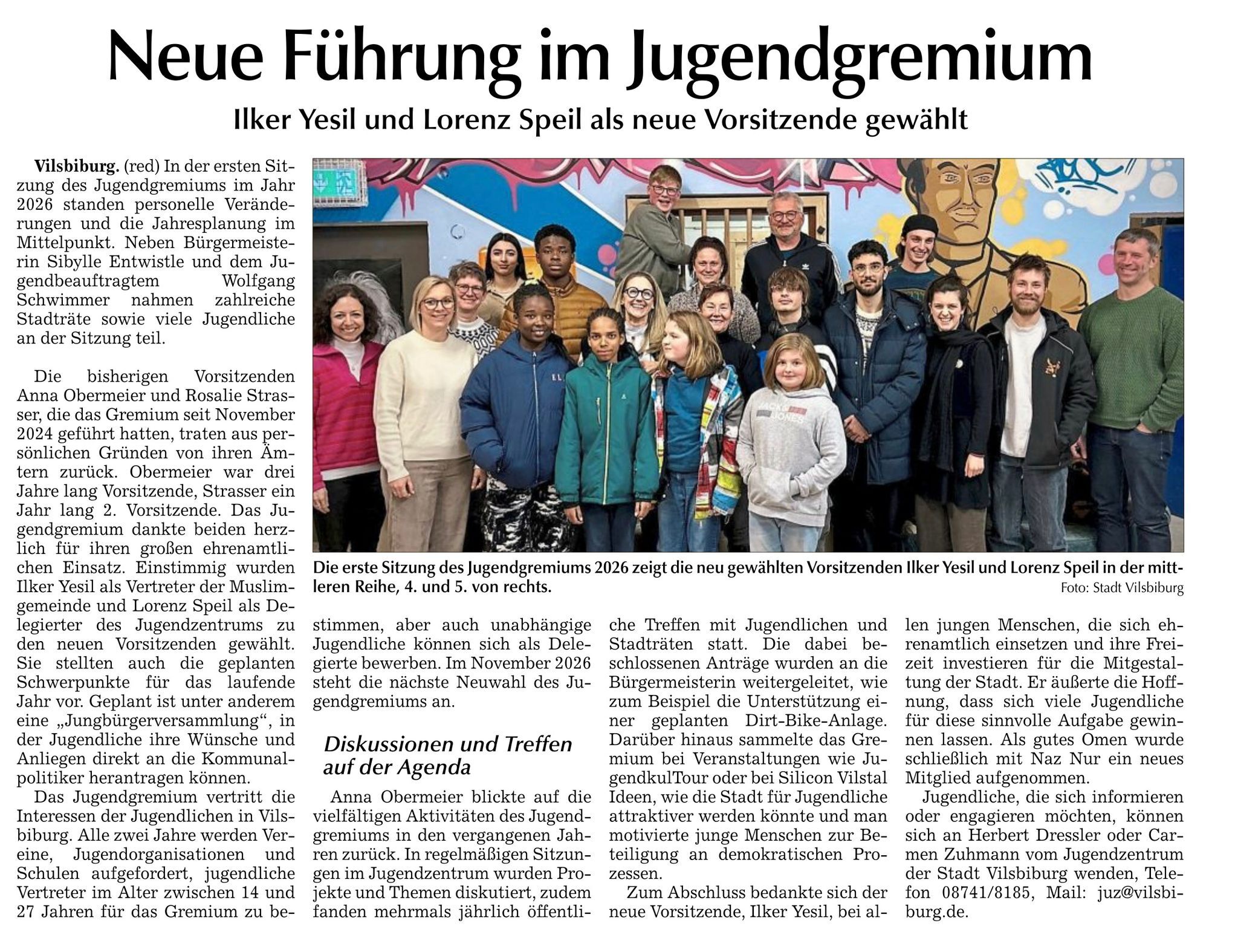 Vilsbiburg. (red) In der ersten Sitzung des Jugendgremiums im Jahr 2026 standen personelle Veränderungen und die Jahresplanung im Mittelpunkt. Neben Bürgermeisterin Sibylle Entwistle und dem Jugendbeauftragten Schwimmer nahmen Wolfgang zahlreiche Stadträte sowie viele Jugendliche an der Sitzung teil.